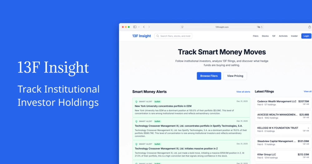 13F Insight is ideal for individual investors, financial analysts, and portfolio managers who seek to enhance their investment research with institutional-grade data and analytical tools. It simplifies the complex process of monitoring institutional capital flows, making sophisticated investment intelligence accessible and actionable. The platform aims to empower users by providing the data and insights needed to follow the strategies of the most successful investors, ultimately helping them to track what smart money is buying and selling with confidence.