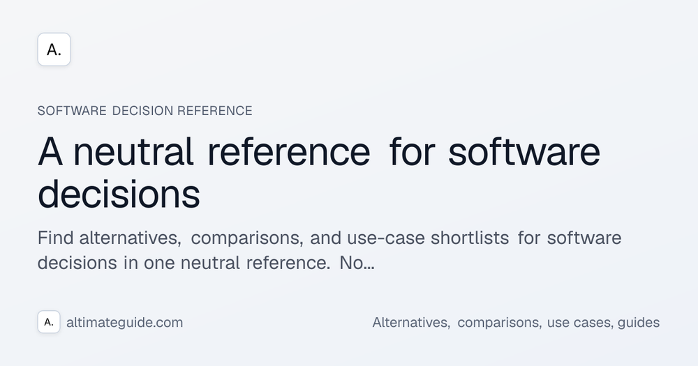 Altimateguide is a neutral software reference platform designed to assist users in making informed software decisions without the bias of reviews, rankings, or sponsored placements. It provides structured pages for discovering software alternatives, conducting side-by-side comparisons, and exploring use-case-specific shortlists. The platform's core offering includes comprehensive tool entity pages, detailed comparisons, and curated use-case shortlists, alongside practical guides for evaluating and selecting tools.