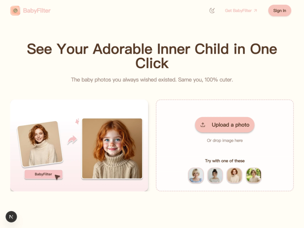 BabyFilter is an innovative AI-powered online tool that instantly transforms adult facial photos into incredibly realistic and adorable baby versions with just a single click.
