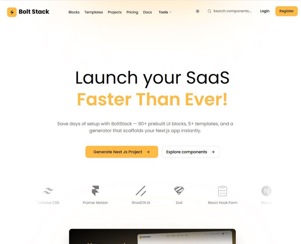 BoltStack is a comprehensive Next.js boilerplate designed to significantly accelerate the development and launch of SaaS applications. It eliminates days of tedious setup by providing a robust foundation with over 90 prebuilt UI blocks, 5 ready-to-use templates, and an instant Next.js app generator. This full-stack solution is engineered to help developers ship faster by focusing on unique features rather than boilerplate code.