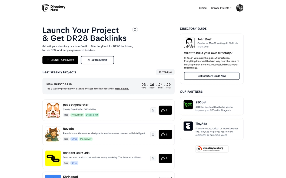 - Resources and Partnerships: Directory Hunt also provides access to a "Directory guide" for those looking to build their own directories and partners with services like SEObot (for AI-driven SEO improvements) and TinyAdz (for product promotion and site monetization), offering a comprehensive ecosystem for project growth.