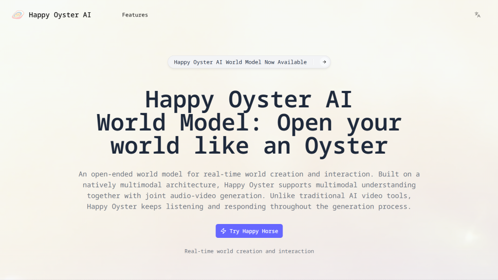 Happy Oyster AI World Model is an innovative, open-ended world model designed for real-time world creation and interaction. Unlike conventional AI video tools that operate on a one-shot workflow, Happy Oyster continuously listens and responds throughout the generation process, allowing the scene to react and evolve in real-time based on user instructions. This unique approach enables dynamic and interactive content generation.The platform is built on a natively multimodal architecture, providing seamless multimodal understanding by supporting text, voice, and image inputs. It also features joint audio-video generation, producing synchronized audio and video within a unified pipeline, further enhancing the immersive experience.Key Features & Modes:Directing Mode: This mode transforms users into real-time directors. It allows them to bring their ideas to life within an endlessly evolving video stream. Users can intervene at any point using text, voice, or images to change camera angles, guide characters, or alter the narrative flow of the story. This mode supports up to 3 minutes duration, 480p/720p resolution, real-time text instruction, multimodal input, and combined audio + video output.Wandering Mode: Designed for exploration, this mode enables users to freely navigate infinitely extendable worlds. Users can roam in a first-person perspective, freely adjust direction and camera movement, and move beyond the initial frame as the world continuously generates new content. This mode offers up to 1 minute duration, 480p resolution, WASD & camera controls, multimodal input, and combined audio + video output.Multimodal Understanding: Happy Oyster's core architecture natively supports diverse input types including text, voice, and images, ensuring the world model comprehends and responds to various forms of user interaction effortlessly.Joint Audio-Video Generation: The platform generates synchronized audio and video simultaneously, providing a cohesive and immersive output. This continuous generation and responsiveness set it apart from traditional tools.Why Choose Happy Oyster?Happy Oyster stands out due to its commitment to real-time interaction, continuous world evolution, and the creation of infinitely extendable worlds. It offers a dynamic environment where user input directly influences the ongoing generation, fostering unparalleled creative control and immersion.Practical Applications & Use Cases:Real-Time Film Production: Ideal for storyboarding, creating concept films, and producing short-form content with live directing capabilities, allowing filmmakers to iterate and refine their vision on the fly.Interactive Drama: Facilitates the creation of engaging interactive short series and brand storytelling, offering participatory experiences where audiences can influence the narrative.World Creation: Enables users to transform simple prompts (text or image) into complex, real-time interactive environments, opening new possibilities for game development, virtual experiences, and digital art.Immersive Exploration: Provides a unique way to step into any perspective and move through generated scenes firsthand, offering a truly immersive experience for virtual tourism, educational content, or creative exploration.Happy Oyster AI World Model empowers creators to build and interact with dynamic, evolving digital worlds, pushing the boundaries of AI-driven content generation.