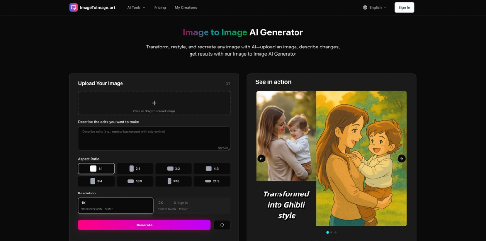 Image to Image AI Generator empowers users to achieve professional-grade image transformations with ease and speed.