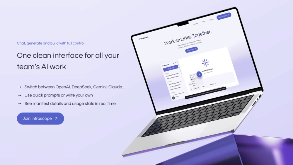 That’s why we built Intrascope. A single workspace where you set up your AI providers, limits and rules, and a familiar chat environment where the whole team works with shared context, clean manifests, structured projects and a clear overview of usage. No confusion. No hidden spending. No lost knowledge.