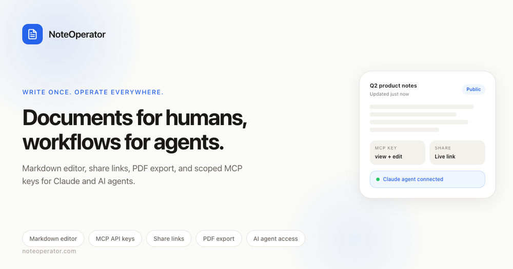 NoteOperator is a streamlined Markdown workspace designed for both human users and AI agents, bridging the gap between overly complex tools like Notion and basic text files. It offers a focused environment for writing, sharing, and managing documents, with a unique emphasis on seamless integration with AI through the Model Context Protocol (MCP).