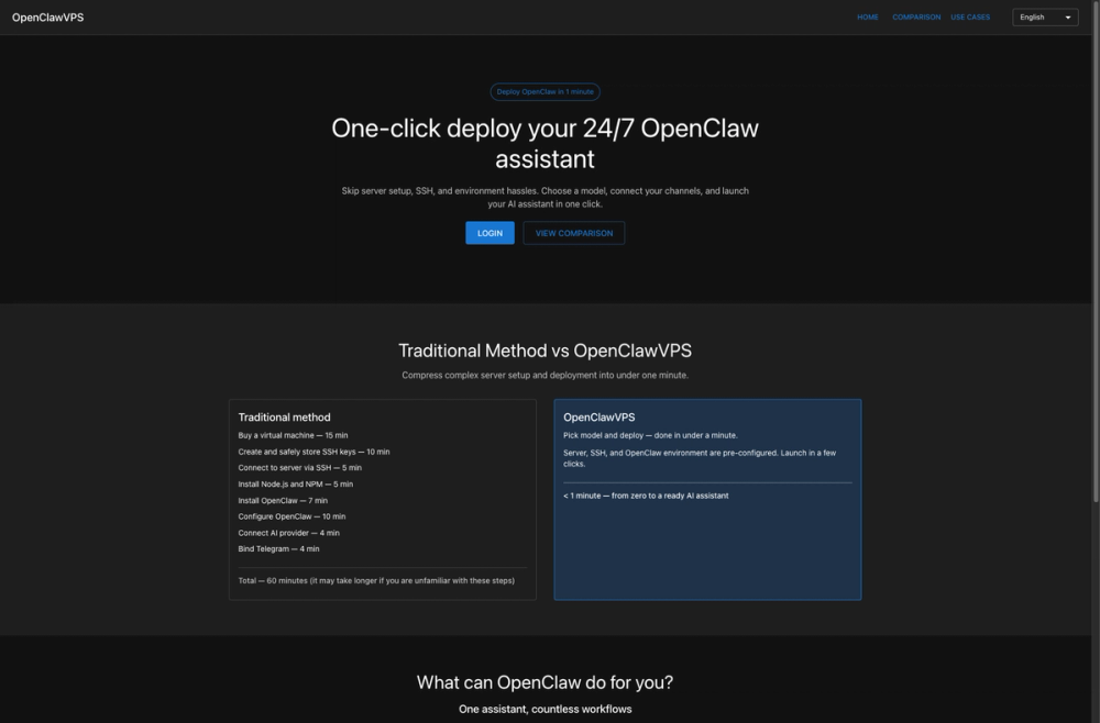 OpenClawVPS: The 60-Second Gateway to a Persistent 24/7 AI Workforce In the rapidly evolving landscape of artificial intelligence, the transition from "Chatbots" to "Autonomous AI Agents" has arrived. However, the biggest hurdle remains infrastructure. OpenClawVPS (https://openclawvps.me/) solves this by offering a "One-Click" deployment solution that moves AI from your local browser to a robust, 24/7 cloud environment. It isn't just a hosting service; it is a professional-grade execution terminal for your digital life. The Deployment Revolution: Shattering the Technical Barrier As clearly illustrated on the platform’s interface, the traditional method of deploying a persistent AI agent is a grueling 60-minute gauntlet. It requires manual VM procurement, SSH key management, environment configuration (Node.js/NPM), and complex provider linking. For most non-technical users, this "technical tax" is an insurmountable wall. OpenClawVPS shatters this barrier. By abstracting the entire backend, it reduces a 1-hour nightmare into a 60-second reality. With pre-configured servers and optimized OpenClaw environments, users go from "Zero" to a "Ready AI Assistant" with a single click. There are no terminal commands, no dependency errors, and no downtime. One Assistant, Countless Workflows: A Universal Ecosystem The true power of OpenClawVPS lies in its "Soul"—a feature-rich matrix that penetrates every layer of modern productivity. The platform empowers users through eight strategic pillars: Intelligent Communication: Automate email summaries, draft follow-ups, and convert meeting notes into structured slide decks. System & Browser Control: Navigate the web like a human to scrape data, monitor prices, and manage cloud files autonomously. Business & Admin: From tax handling and payroll calculations to drafting NDAs and researching competitors, OpenClaw replaces hours of administrative drudgery. Creative & Lifestyle: Generate images, edit videos, book flights, and even receive recipe recommendations based on your current pantry. Why OpenClawVPS? The Value of Persistence The defining differentiator of OpenClawVPS is Cloud Persistence. Unlike local AI tools that die when you close your laptop, OpenClawVPS ensures your AI agents stay active 24/7. It acts as your "Night Shift" digital workforce—monitoring markets, managing calendars, and executing workflows while you sleep. Conclusion: Your Intent, Cloud Execution OpenClawVPS (https://openclawvps.me/) is the definitive bridge between human intent and digital execution. By hiding the complexity of cloud infrastructure behind a sleek, intuitive UI, it fulfills the promise of autonomous AI. Whether you are an elite developer or a busy entrepreneur, OpenClawVPS ensures your digital agents are always online, always ready, and always working for you.