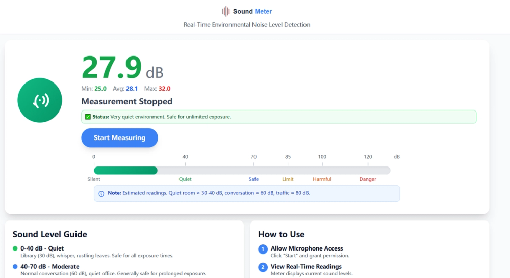 RealtimeSoundMeter.org is a free, browser-based environmental sound level meter designed to help users easily measure and visualize ambient noise in real time. By using your device’s microphone and modern web audio technology, the tool provides instant decibel (dB) readings without requiring any software installation, plugins, or account registration. With just one click, users can turn their browser into a practical sound meter and gain immediate insight into the noise levels around them.
