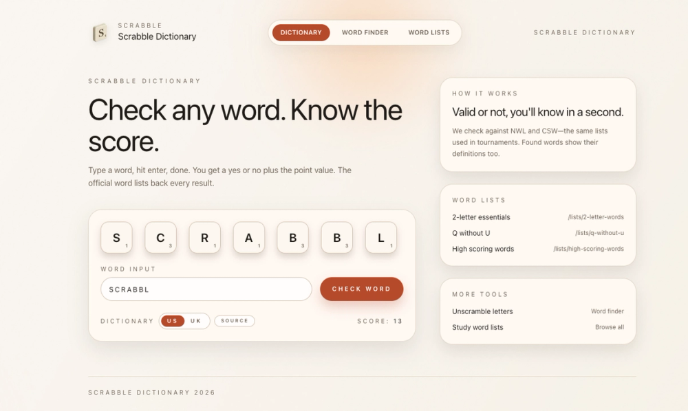 This site is built for Scrabble players who want fast, reliable answers while they practice or prepare for games. It focuses on two everyday needs: checking whether a word is valid in official lists and finding playable words from a rack of letters. Both tasks are handled by a simple, direct interface so players can stay focused on the game rather than wrestling with a complex tool.